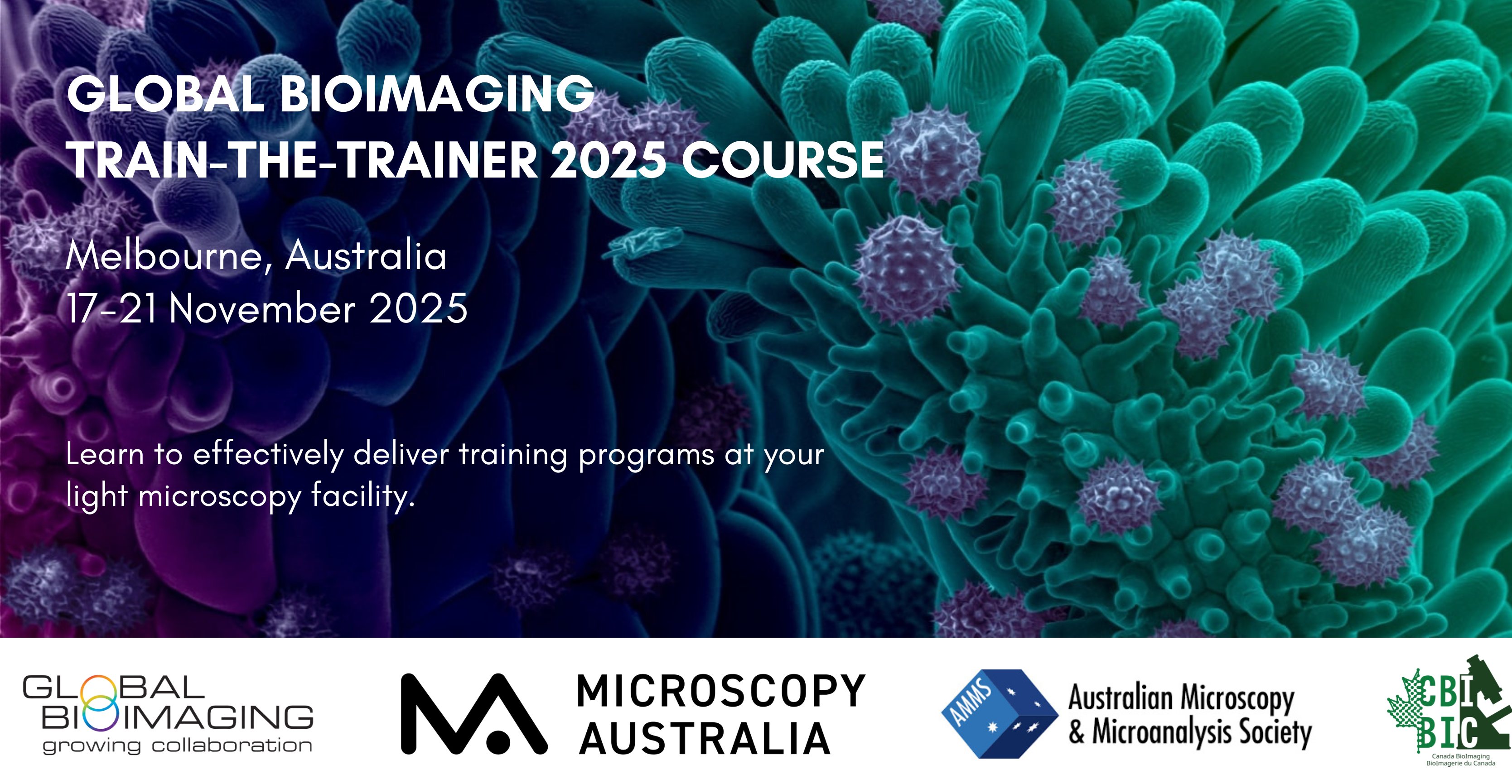 Global BioImaging Train-the-Trainer 2025 Course is a course jointly organized by Global BioImaging, its partner organizations Microscopy Australia and Canada BioImaging, and the Australian Microscopy & Microanalysis Society and Light Microscopy Australia.